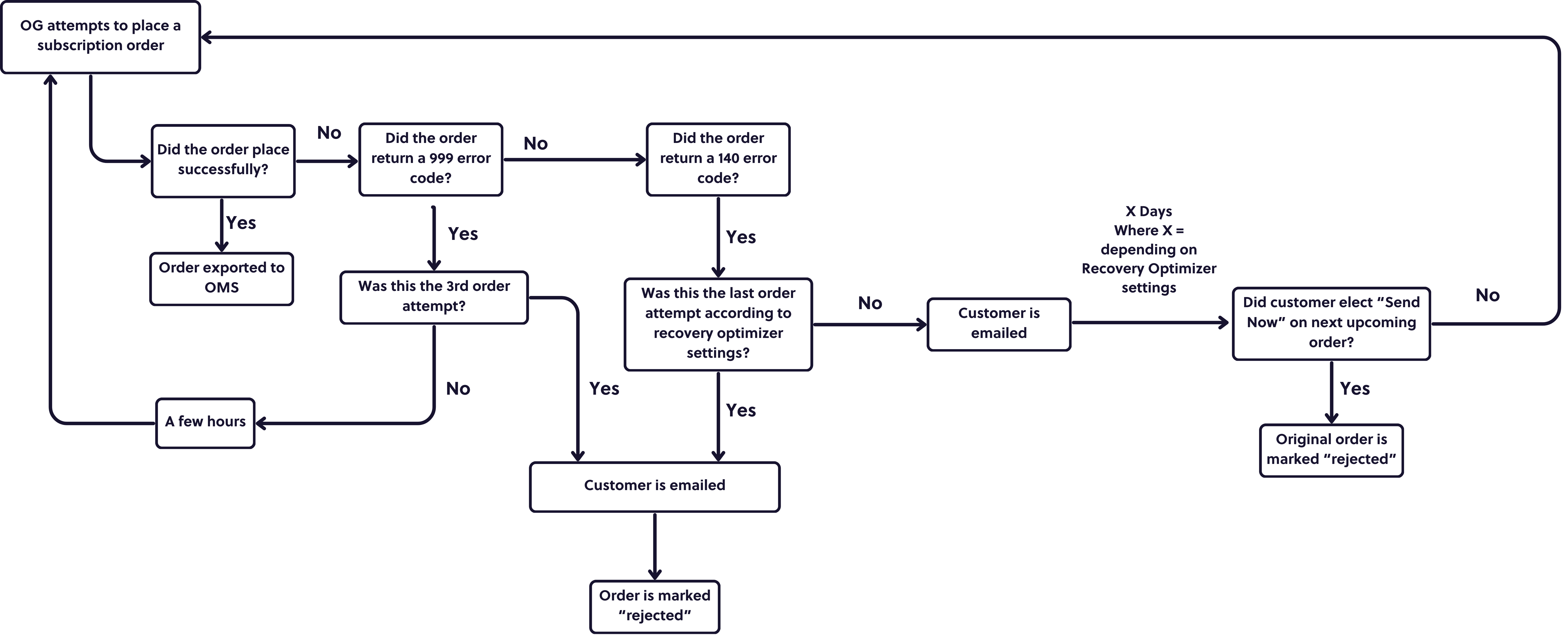 Ordergroove will retry all payment requests that return a 140 error response a set number of times based on your store settings. The first retry will take place 3 days after the initial attempt, and the last retry will take place 3 days after the first retry attempt. The customer will receive an email trigger to update their payment method between attempts (pending setup in Ordergroove). You must ensure the 140 response is correctly mapped for your order placement endpoint. If all retries fail or the customer clicks send now for the same item(s), the original order is marked as rejected.
