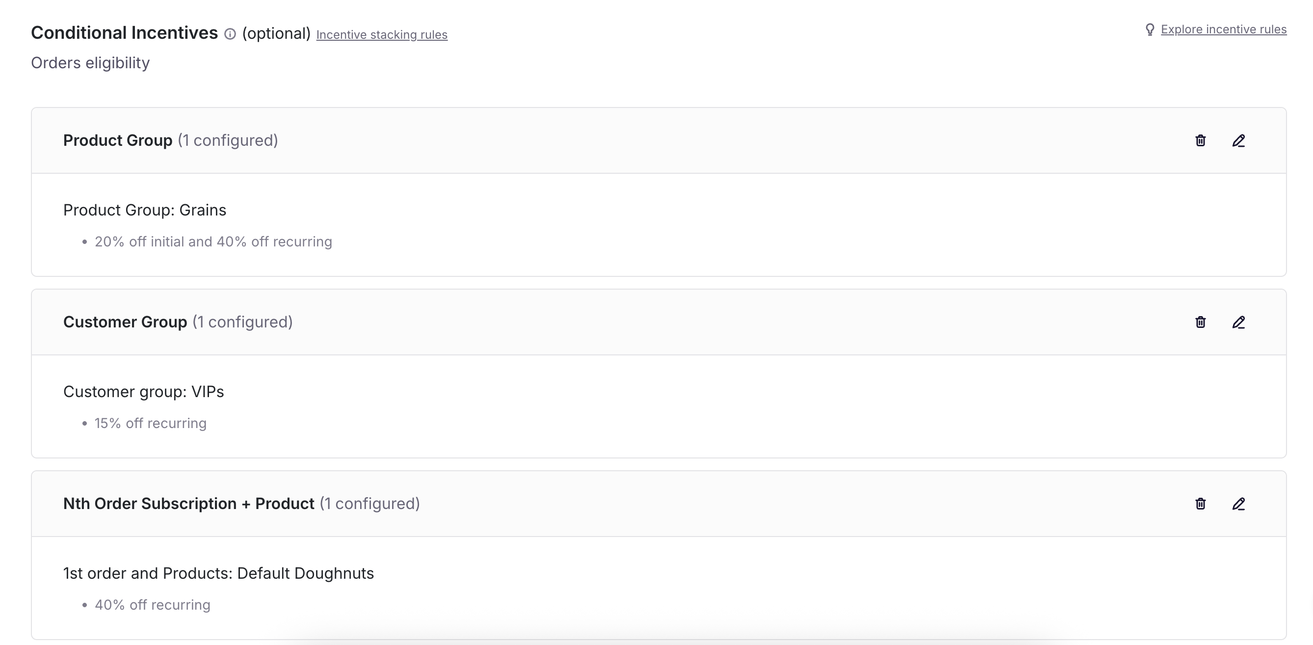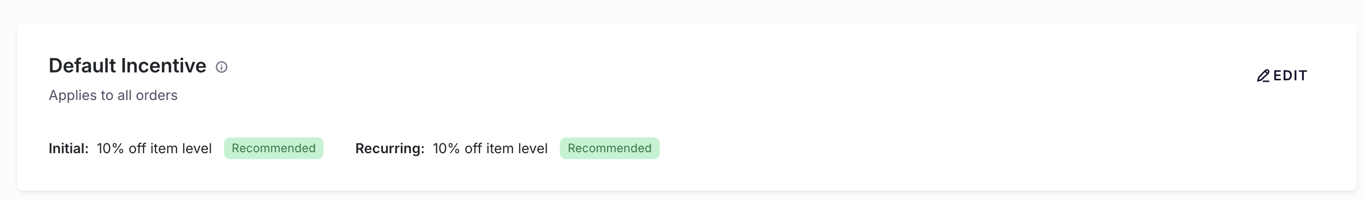 - Default Incentive: This is the baseline incentive that all customers receive unless their purchase qualifies for a conditional incentive. It is a flat-rate discount applied to all subscription items, such as a 15% discount on all initial and recurring orders.